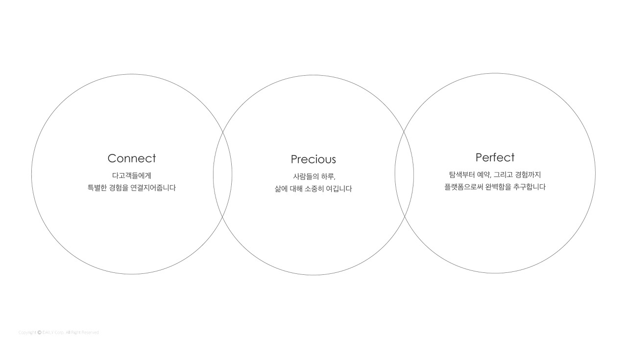 셋_Perfect. 데일리의 심벌은 안정적인 구조를 지닐 수 있도록 견고한 선으로 균형 있게 제작되었습니다. 이런 심벌에서부터 나오는 완벽함은 탐색부터 예약, 그리고 경험까지 플랫폼으로써 추구하는 완벽함을 뜻합니다.