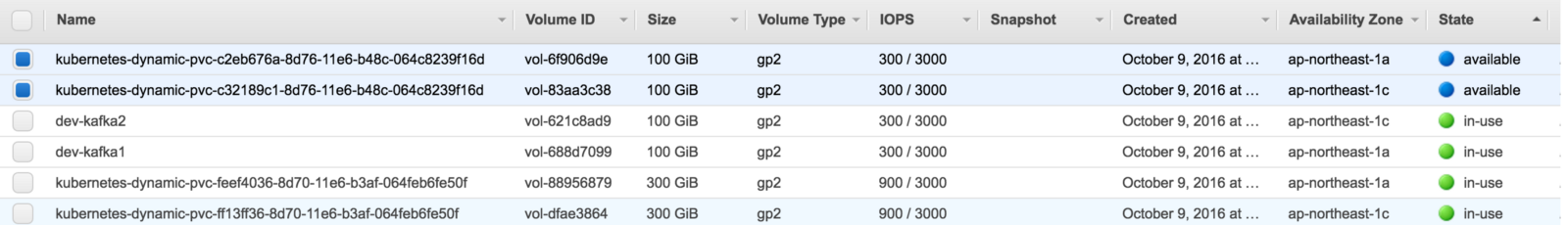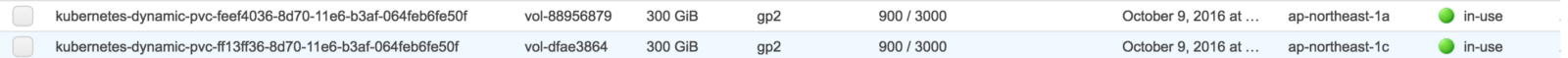# storages.yaml apiVersion: storage.k8s.io/v1beta1 kind: StorageClass metadata: name: default1a provisioner: kubernetes.io/aws-ebs parameters: type: gp2 zone: ap-northeast-1a iopsPerGB: “10” — - apiVersion: storage.k8s.io/v1beta1 kind: StorageClass metadata: name: default1c provisioner: kubernetes.io/aws-ebs parameters: type: gp2 zone: ap-northeast-1c iopsPerGB: “10”