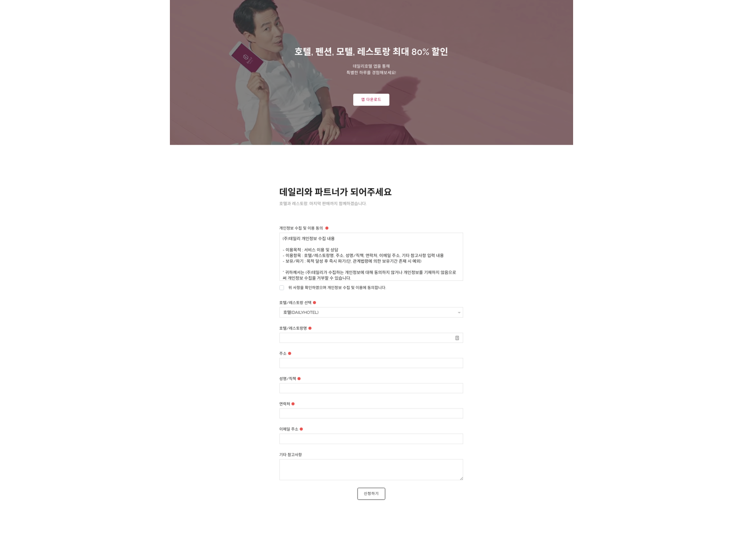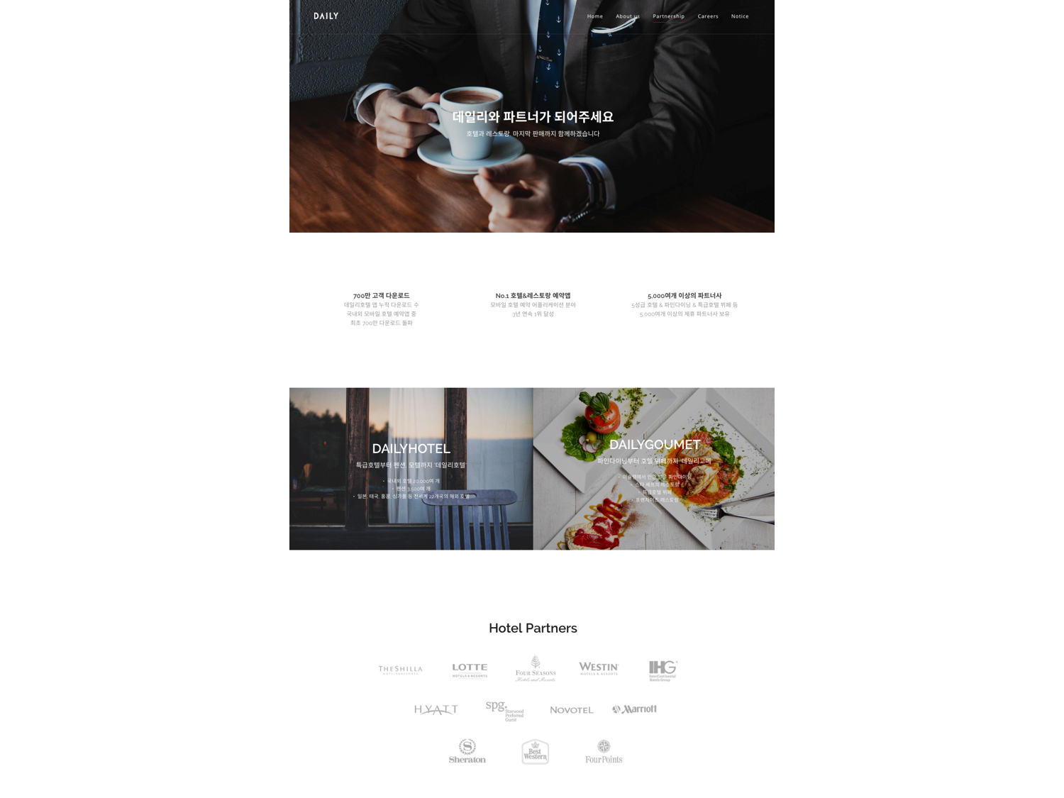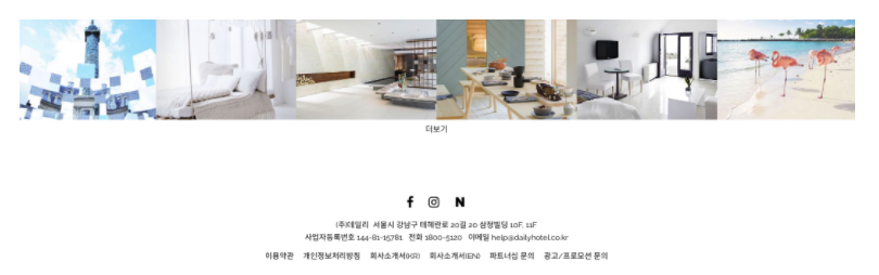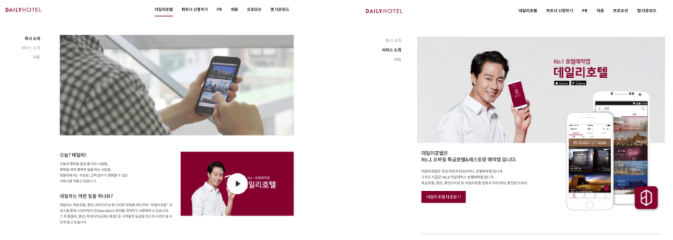 또한 단순히 내용을 채워가기보다는 모델력(데일리호텔 모델 조인성)을 발휘할 수 있는 이미지/영상을 넣는다던가, 제휴 제안 입력폼에는 어떤 양식을 적용시켜야 한다던가의 디테일한 요소들을 설정 및 적용합니다.