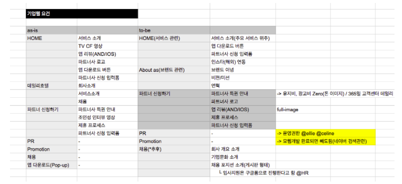 위 표처럼 AS-IS와 TO-BE를 비교하며 수정 및 보완해야 할 부분을 체크했습니다. 요소를 덜어내고 추가하는 가장 중요한 과정이었죠.