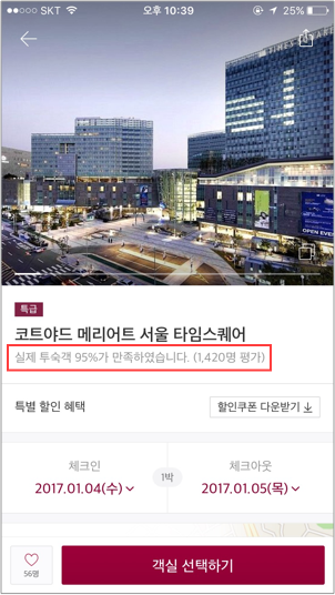 현재 데일리호텔의 업장(호텔 또는 레스토랑) 상세화면에서 실제 이용자 중 몇퍼센트가 이용에 만족하였는지를 보여줍니다. 이는 사용자들이 구매를 결정하는데에 중요한 요소가 됩니다.