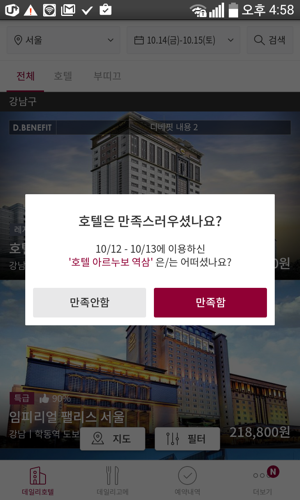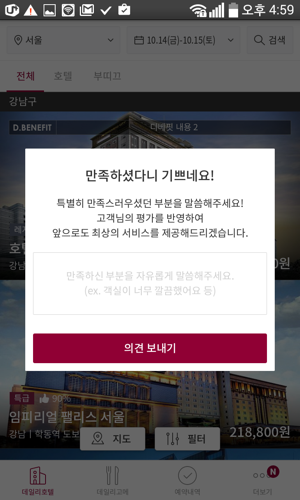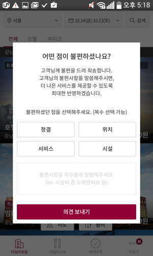 이는 데일리호텔의 쉽고 간단한 예약서비스의 컨셉에서 비롯된 정책이었습니다. 사용자가 리뷰 내용을 하나하나 보는 수고를 덜고, 확실한 측정 결과(만족도)를 제시하여 고민하는 시간을 줄여주고자 했습니다.