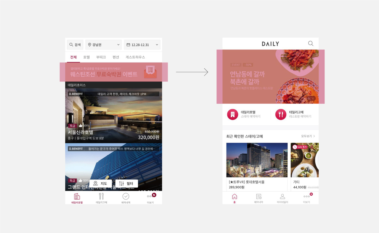 홈화면에는 '데일리호텔/데일리고메' 버튼이 새로 생성되었습니다. 사실상 두 버튼이 예약을 위한 제일 첫 단의 경로였기 때문에 이 버튼의 주목성을 방해하지 않는 선에서 레이아웃 및 톤 앤 매너를 정의해야 했어요. 또한 영역이 커진 만큼 주목도가 높아지기 때문에 유저가 지루함을 느껴서는 안 되었죠.