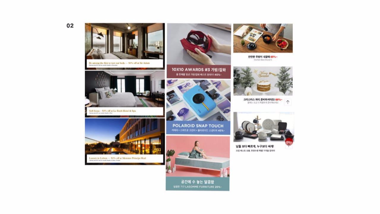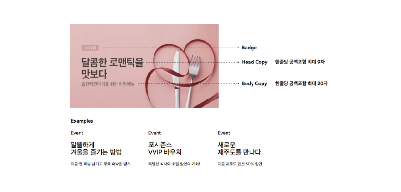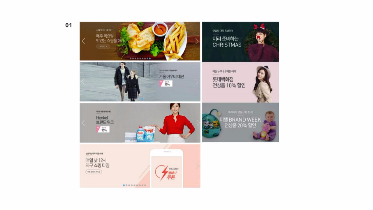 가이드를 잡기에 앞서, 타사의 경우 홈배너를 어떻게 활용하고 있는지 조사가 필요했습니다. 많은 자료들을 모아 분석해본 결과 데일리의 경우 크게 세 가지 형태로 배너를 표현할 수 있음을 도출할 수 있었죠.