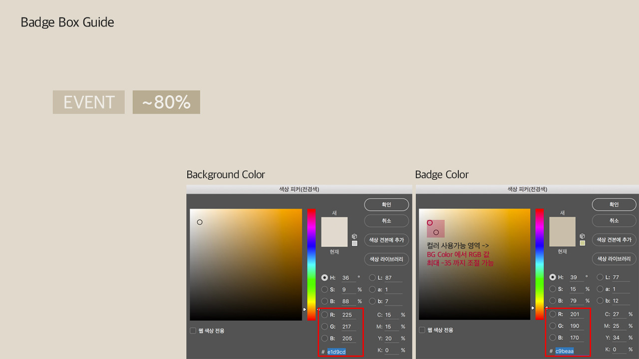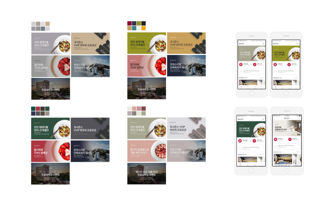 배너의 레이아웃이 얼추 뼈대를 드러내는 시점에 함께 적용시킬 수 있는 컬러를 찾아야 했습니다. 앞서 말했듯이 예약 경로인 버튼의 주목성을 해치지 않는 톤 앤 매너를 유지하고, 마케팅적인 성격보다는 추천의 성격을 띠기 위해 차분한 톤이 필요했습니다.