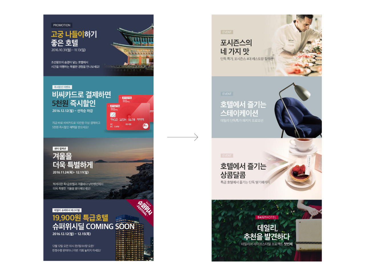 '데일리호텔'앱 2.0 버전에는 기존에 없던 홈화면이 추가되면서 마케팅 성격의 배너 영역이 확대되었습니다.(이미지 참고) 해서 데일리의 첫인상을 책임질 새로운 배너 가이드의 필요성을 느끼게 됩니다.