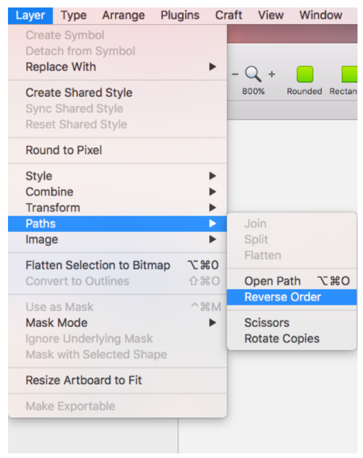 Path가 선택된 채로 Layers > Paths > Reverse Order을 클릭합니다.