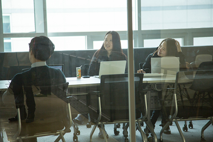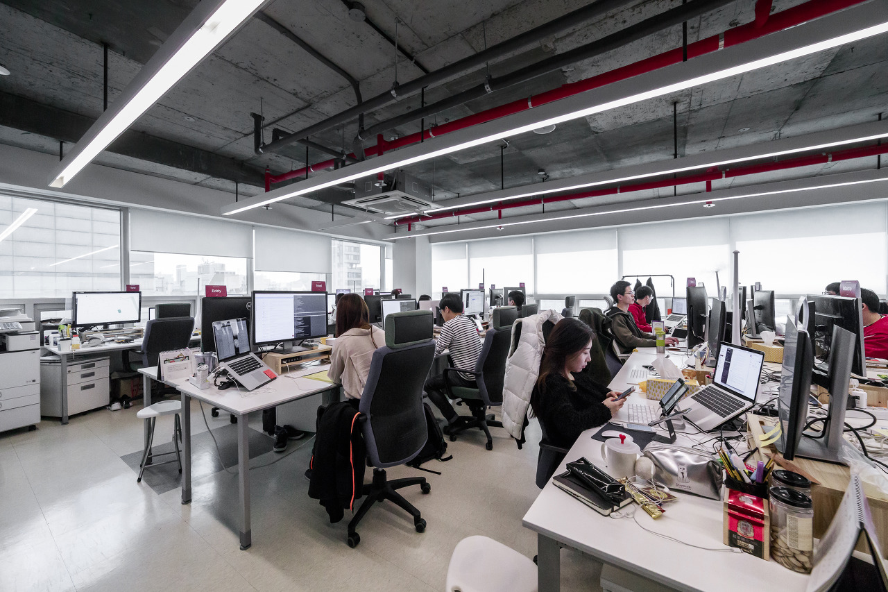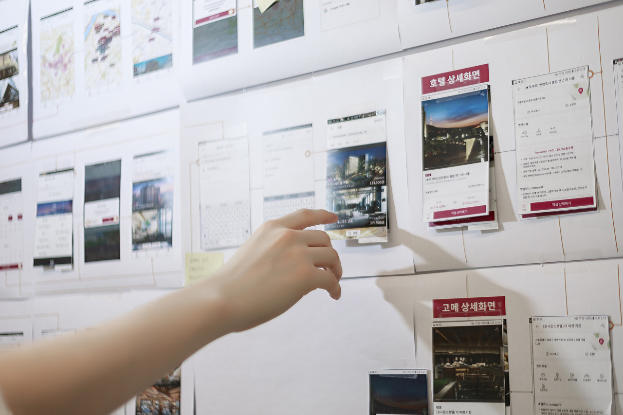 모델이 정해진 후에는 장소를 선정하는 작업을 했습니다. 우리에게 필요한 컷은 회의 컷, 핸드폰 컷, 카페테리아 컷, 업무 컷, 인테리어, 전사회의 컷이었어요. 해서 이 컷들을 촬영하기 위한 (햇빛이 잘 드는) 회의실, (항상 전문적이게 보였던) UI/UX Flow Board, (예쁜 선인장이 포인트였던) Sunny의 책상 등 장소들을 촬영 전 지정해두었어요.