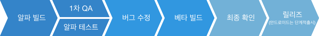 1차 QA 및 전사 베타버전 사용의 피드백을 통해 나온 버그/주요 기능에 대해 마지막 점검하는 절차입니다. 이 부분은 제품책임자(PM)가 담당을 하며, 이 부분을 통과하면 릴리즈 단계로 진행되어 사용자에게 업데이트 된 앱이 전달됩니다.