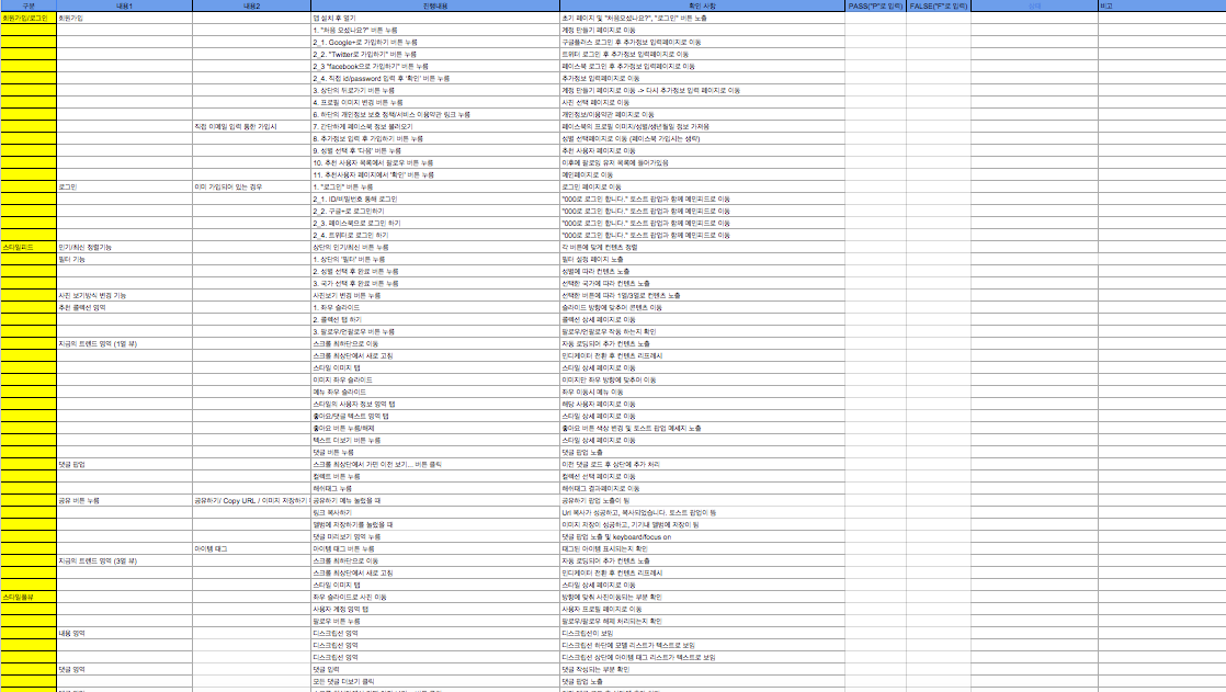 테스트 케이스(TC)를 통한 테스팅은 핵심적인 기능 및 주 사용케이스에 대한 검수작업이라고 보시면 됩니다. 게임 혹은 복잡도가 높은 서비스의 경우에는 매 업데이트마다 모든 케이스에 대한 테스트가 어렵고 비효율적이기 때문에 리스크 분석기법, 탐색적 테스팅, 경계값 테스팅 등과 같은 방식을 사용하지만 스타일쉐어 서비스의 경우 상대적으로 복잡도가 낮아 매 업데이트 마다 대부분의 기능에 대한 테스팅을 진행합니다(TC로 100% 커버리지를 목표로 하지 않습니다. 불가능하다는 것을 인정하고 진행하는 것이 효율적). 테스트케이스 작성시에 유의했던 부분은 쉽고 명확하게 케이스를 명시해서 오류에 대한 판단이 명확하도록 하고 스타일쉐어 앱을 처음 본 사람도 바로 테스트가 가능하도록 작성하고 있습니다. (스트레스 테스트는 특이 사항이 있을 경우에만 진행합니다.)