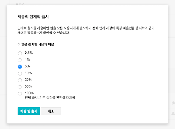 모든 테스트 과정을 완료한 뒤 구글플레이 개발자 콘솔에서 앱 업데이트시 ‘지금 출시’가 아닌 ‘단계적 출시’로 선택합니다. 그리고 비율을 선택할 수 있는데 이 비율은 업데이트가 적용되는 사용자 비율을 설정하는 기능입니다. 즉, 전체 사용자가 아닌 미리 지정한 비율의 사용자에게만 업데이트 버전을 제공함으로써 우선적으로 우리가 예상하지 못한 버그나 불편한 부분이 있는지 확인해볼 수 있습니다. 스타일쉐어팀의 경우 5%의 사용자 비율로 단계적 출시를 1~2일 동안 진행한뒤 버그 리포팅 및 CS내용 확인 후 100% 대상으로 업데이트를 진행합니다.(5% 단계적 출시 이후 패치된 버전을 배포하면 해당그룹(5%)에게만 업데이트 됩니다.)