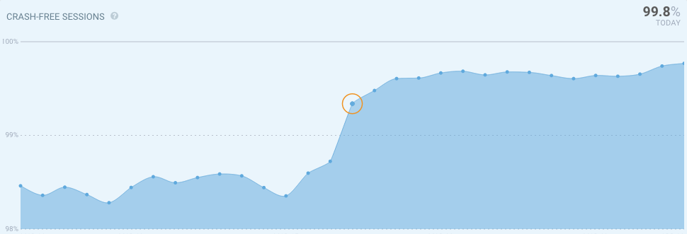 4월 13일 기준으로 Crash Free Sessions는 전체 사용자 중 99.8%의 안정성을 가져가고 있으며(이전에는 95~96%), 기존에는 주말과 같이 사용자가 많은 경우 그만큼 크래시 발생빈도도 높았지만 최근 버전에서는 주말/평일 관계없는 그래프를 보이고 있습니다.