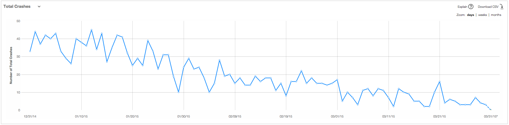 위 지표는 1월~3월 까지의 Flurry의 안드로이드 버전 Crash Report를 캡처한 화면입니다. 1월 초만 해도 일 40회 정도의 크래시가 발생했다면 최근은 일 3~5회 정도로 개선된 모습을 확인할 수 있습니다.