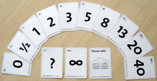 Planning Poker는 0.5부터 시작해서 1, 3, 5, 8, 13, 20, … 100과 같이 피보나치 수열로 증가하는 숫자를 가진 카드 덱입니다. 리포터의 설명이 끝난 뒤 스크럼 마스터가 하나, 둘, 셋을 외치면 각자 생각한 일감의 크기에 맞는 카드를 꺼내고, 스크럼 마스터는 구성원들의 추정치가 최대한 가까워지도록 부가설명이나 질문을 유도합니다.2