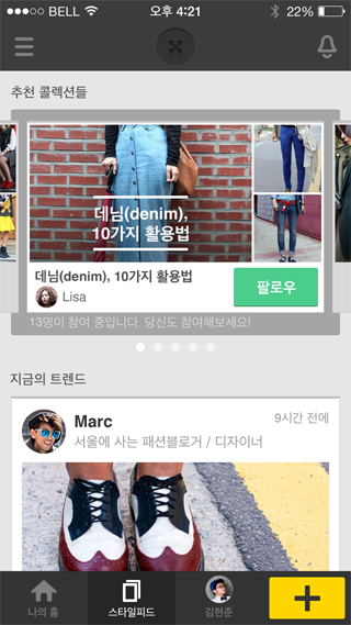 Style feed. 스타일쉐어 앱을 켜자마자 보이는 discover feed입니다. ↩
