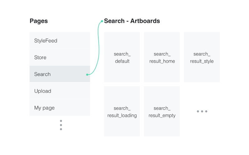 우선 프로덕트를 큰 단위로 그룹을 나누었고 그 안에 속해 있는 모든 페이지 디자인을 아트보드로 나열했습니다.