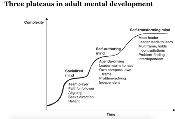 책에서는 성인 시기 성장에 대해 Mental Complexity(정신 성숙도)로 설명한다. 정신 성숙도는 3단계의 정신으로 구성되는데 첫 단계는 사회적 정신(socialized mind), 두 번째 단계는 자기통제 정신(self-authorized mind), 세 번째 단계는 자기변혁 정신(self-transforming mind)이다.
