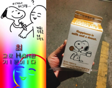 <왼쪽: 스누피우유의 효과 (출처: 인터넷 검색) / 오른쪽: 내가 마신 스누피우유>