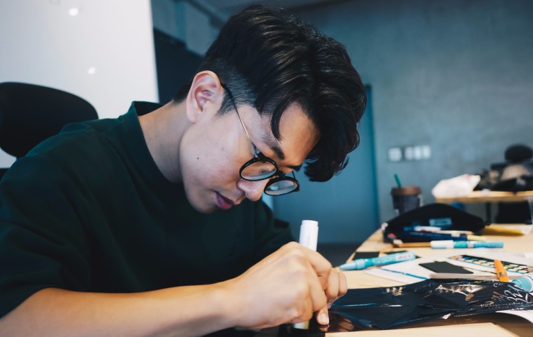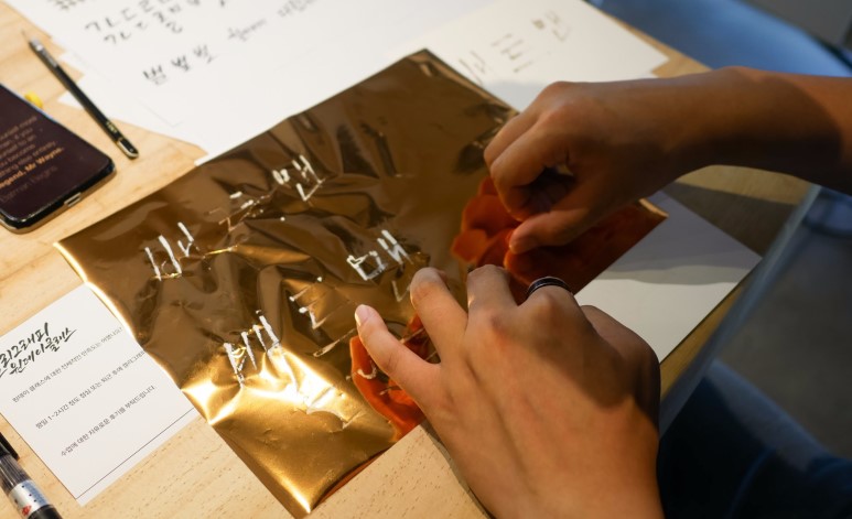 오늘의 하이라이트는 글씨에 금박 입히기! 조금 삐뚤빼뚤한 글씨도 금박을 입히면 제법 그럴듯해보이는 마법을 경험할 수 있죠. 한 팀원은 꿋꿋하게 '배트맨'을 새겼습니다ㅋㅋㅋㅋ