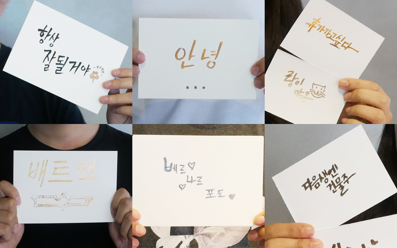 어때요? 하루 배운 것 치고는 제법 그럴듯한 캘리그라피가 완성됐죠? 작가들이 써낸 완벽한 글씨에 비하면 많이 부족하지만, 마음을 꼭꼭 담아 쓴 글씨인만큼 연인, 친구, 가족에게 큰 선물이 되었어요!