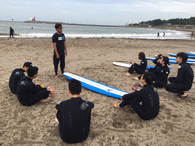 의외로 따뜻한 수트로 갈아입고, 해변에 옹기종기 모여앉아 강습을 들었어. 오늘의 목표는 단 하나! 보드 위에서 일어나보자!
