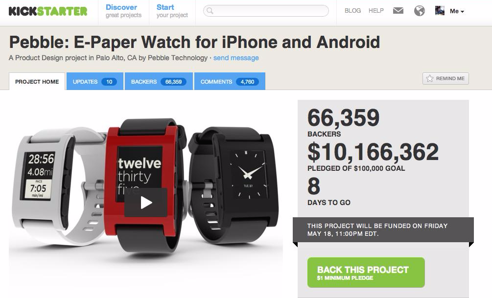 페블 킥스타터 캠페인 결과페블의 CEO Eric Migicovsky는 2011년 Y-combinator 겨울배치에 속해 있었지만 제대로 투자를 이끌어내지 못한다. 그해 애플의 스마트워치가 출시된다는 소문이 무성해지기 시작했고, Eric은 그 타이밍을 놓치지 않기 위해 크라우드펀딩을 이용하기로 마음먹는다. 2012년, 결국 킥스타터에서 잭팟을 터뜨리고 페블은 일약 하드웨어 스타트업과 스마트워치 웨어러블의 스타로 등극한다. 애플의 워치때문에 생긴 관심이 페블을 통해 발산되는 어부지리도 있었던 덕인지, 2014년 누적 백만대를 팔아치우더니 2015년 페블타임(Pebble Time)으로 다시 킥스타터에서 17분만에 목표금액 50만불을 달성하고 최종 75,000여명에게서 $20.3M를 달성하는 기염을 토했다.